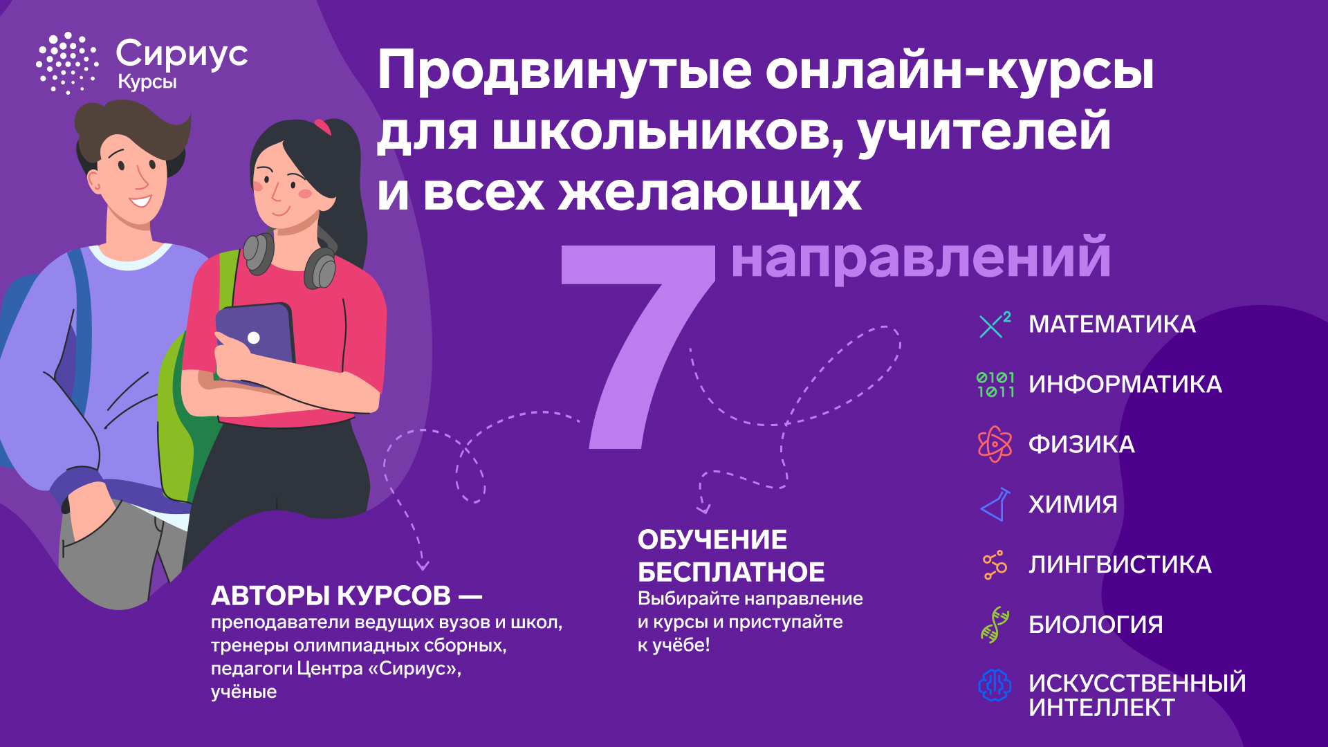 "Сириус" - бесплатные продвинутые онлайн-курсы для школьников, учителей и всех желающих по 7 направлениям на сайте https://edu.sirius.online